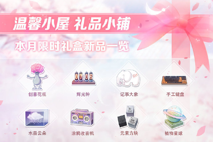 5月31日更新后~6月6日,温馨小屋日常礼盒限时上架。自己动手组装的机械键盘、你们努力栽培的植物星球、用真实元素制作而成的方块摆件、像要给你一个大拥抱的造型花瓶……与他在家中的时光更添趣味!