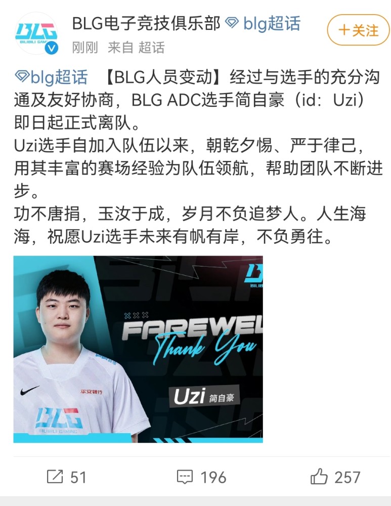 随着Bin和Breathe的互换尘埃落定,UZI的去留成为了今晚重中之重。在煎熬之中,BLG放出了UZI离队的消息,而就这么一大瓜让今晚的电竞粉都不再冷静。UZI离队造成的影响也是极大的。