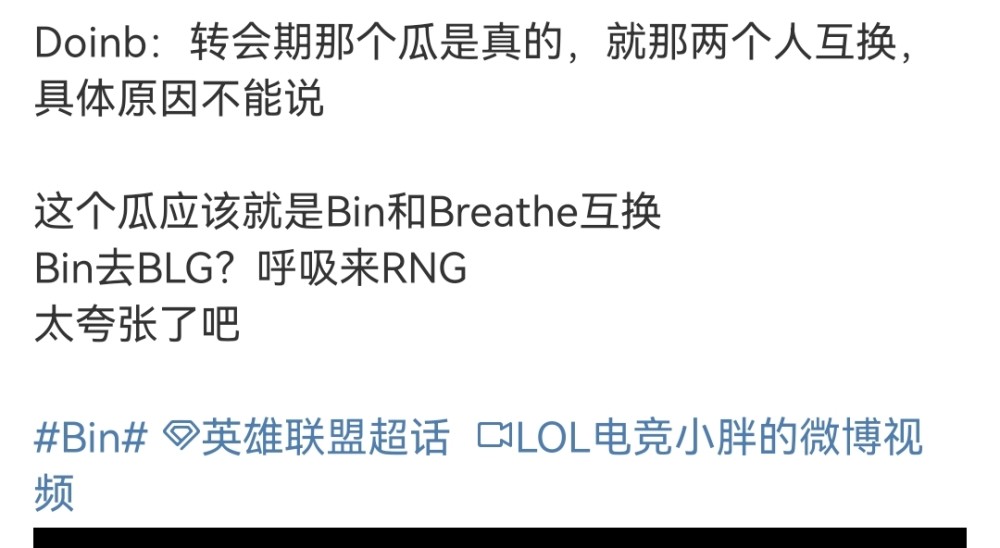 随着转会期接近尾声,在这个充满欢声笑语的六一夜晚,却迎来了电竞圈的大瓜。事件的起因是硬币哥爆料转会期的那个瓜是真的。而关于这个瓜就是Bin和Breathe互换。而这个消息在不久之后被证实。