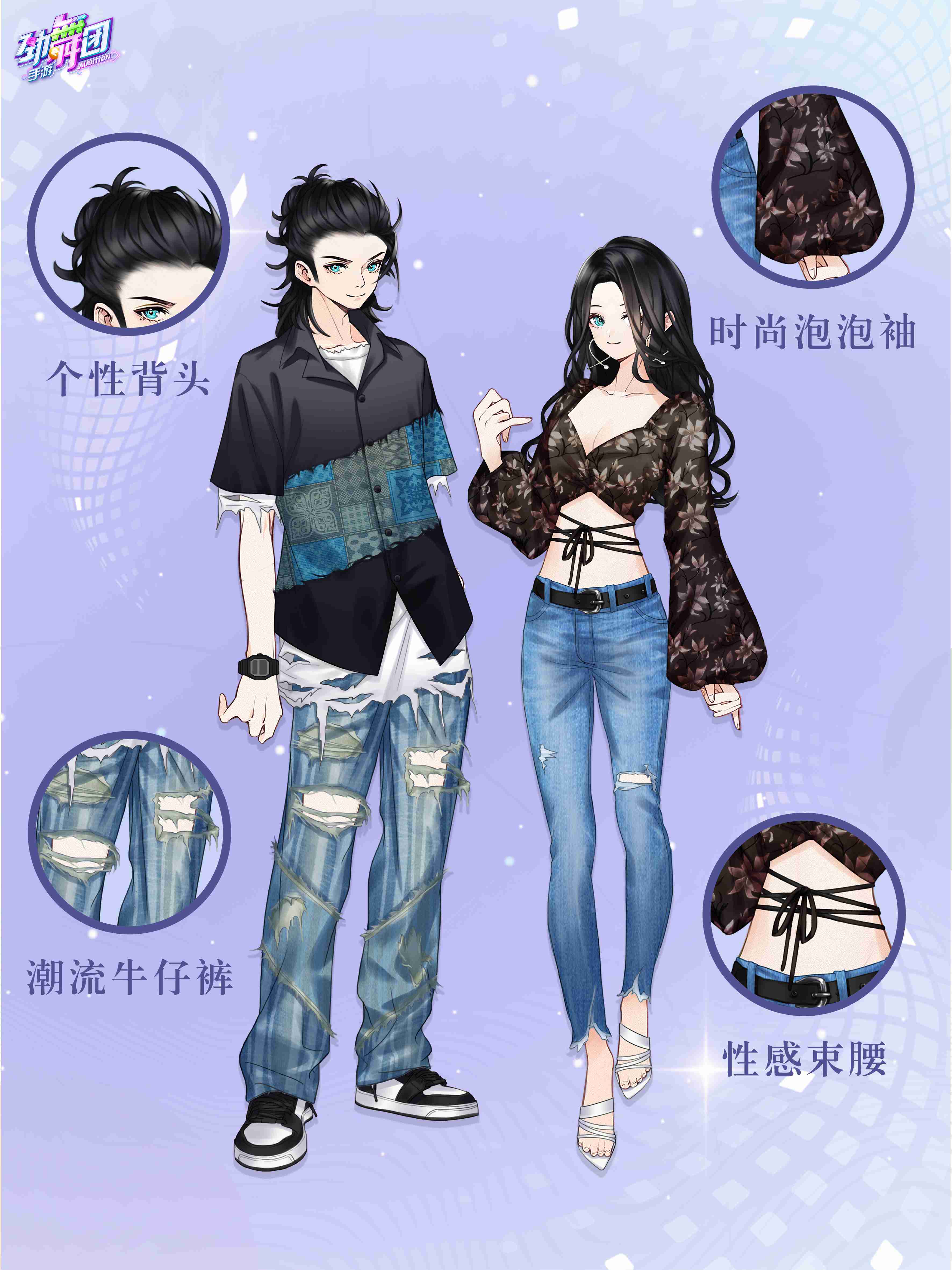 男款韩潮风范采用白色破洞T恤作为内搭,外加复古风黑色拼接衬衫,叠穿的设计凸显随性与潮流,再配上有花纹点缀的破洞牛仔直筒裤以及新潮个性的背头发型,瞬间提升整体气质,给人眼前一亮的感觉。穿上潮酷时尚的韩潮风范,化身AU酷飒达人,来AU世界打歌尬舞吧!
