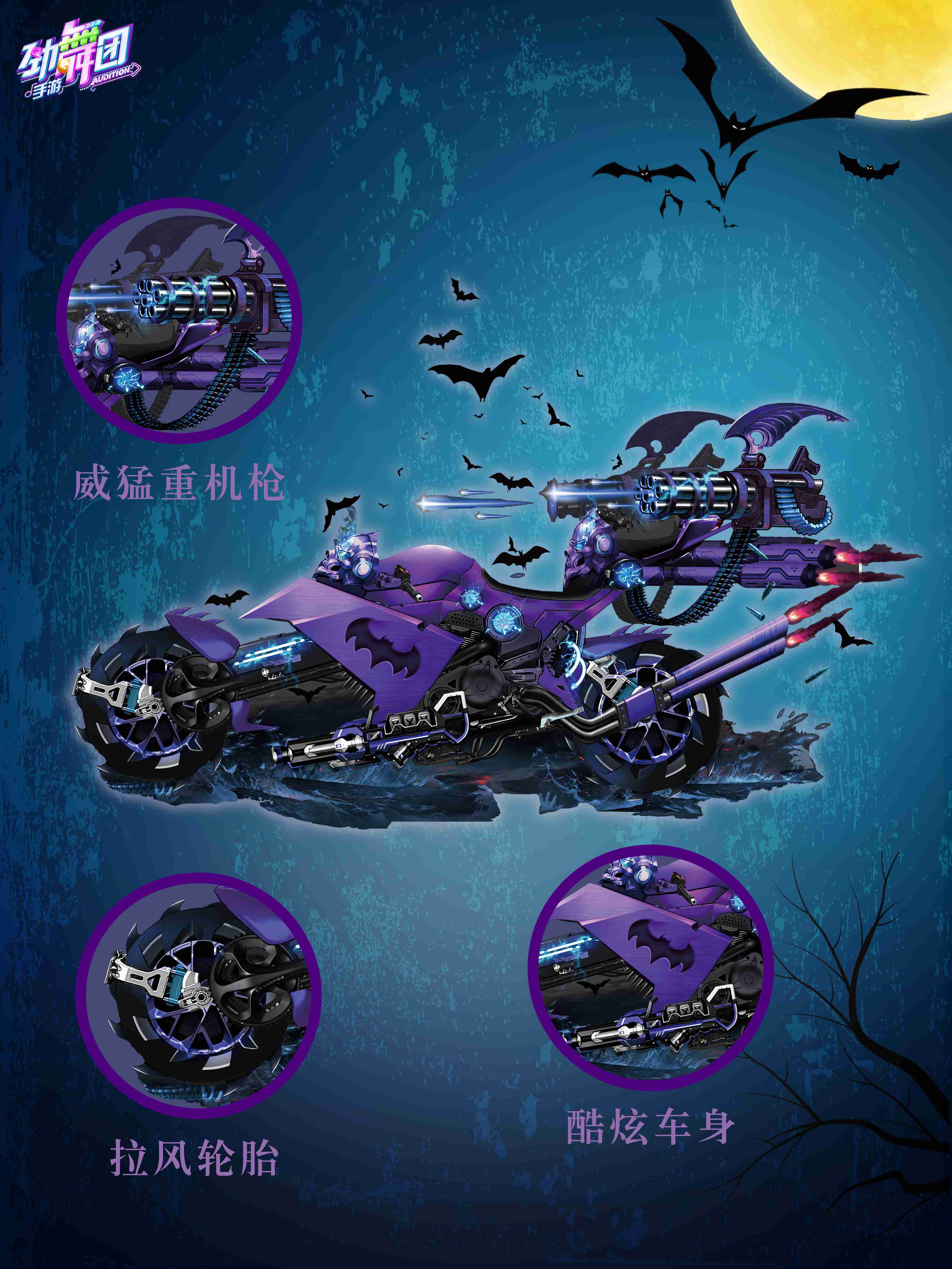 本期上新的双人坐骑【暗黑骑士·紫】,狂拽酷炫的摩托机车火热来袭!有型拉风的流线型车身设计搭配神秘暗黑的骷髅车头,尽显个性霸气;重工机械配件与旋风齿轮,新潮又前卫。双人坐骑暗黑骑士·紫可以在【服饰工坊】染色为双人坐骑暗黑骑士·黛/桃,染色后的暗黑骑士色泽质感满分!双人坐骑暗黑骑士·紫可进化为魔都骑士·紫/黛/桃,进化后的暗黑骑士更加激情炫酷、重工潮流。