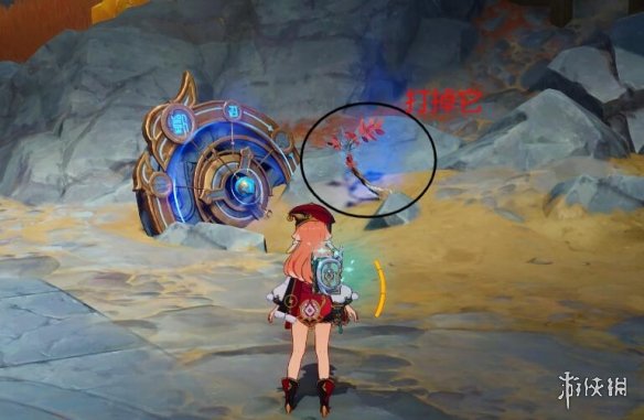 首先第一个秘境里面打完盗宝团来到这个转盘前,一定要记得打碎这个树枝,不然一会就转不动指针了。