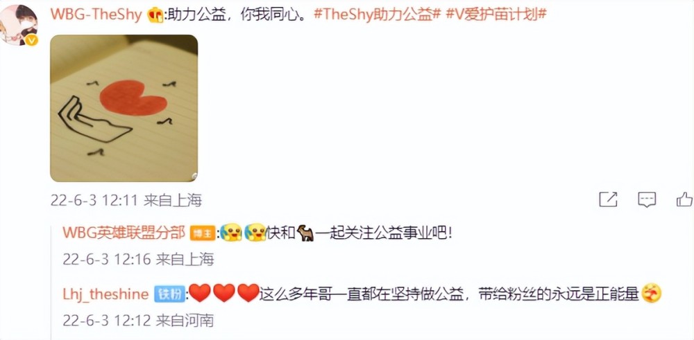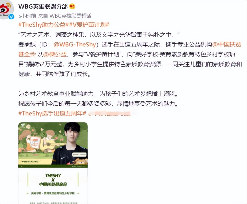 WBG官博也是为Theshy点赞,这波参与V爱护苗计划,向美好学校美育素质教育特色乡村学校项目捐款,意义很重大,儿童的素质教育和健康,就是祖国的未来。如此正能量的事情,WBG官博要是不透露,Theshy又要默默做一波好事了。要知道,这已经不是Theshy第一次助阵公益了,而且每次出手都是大手笔,值得点赞。