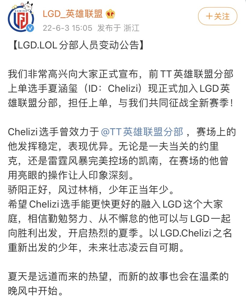 之所以LGD战队今天会引起大家的部分关注,原因是他们官博发布一则官宣,内容是LGD战队引入了新的上单,这个上单就是之前在TT战队效力的Chelizi,没错,倒数第二的战队引入了倒数第一战队的上单。