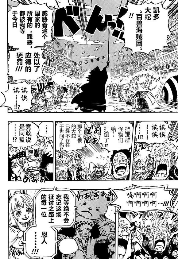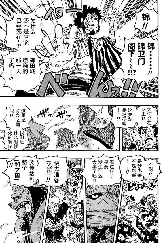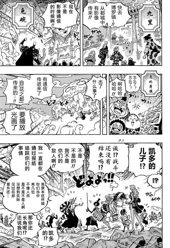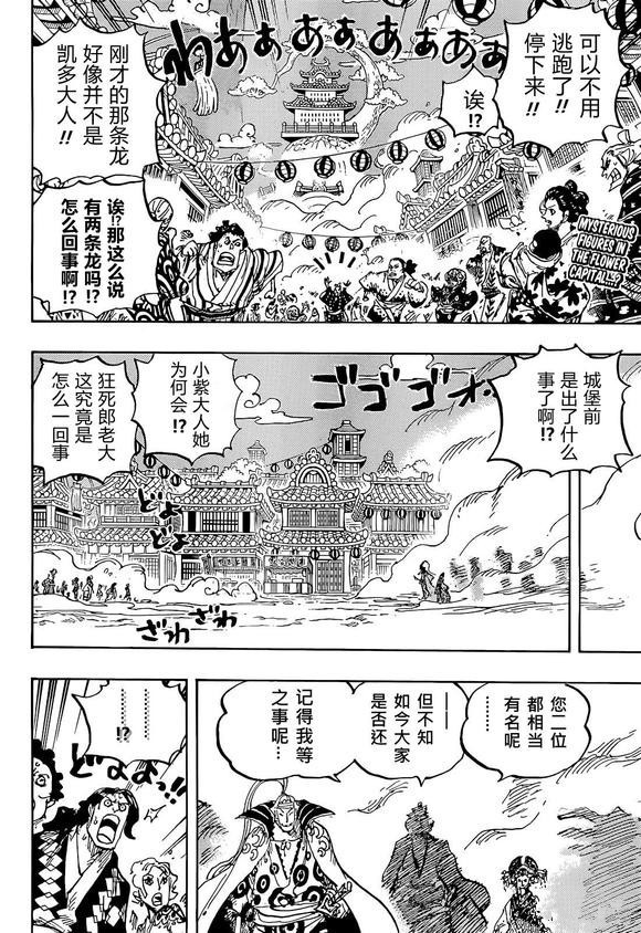 本话开始,因为之前桃之助的话,花之都的民众也知道了那条龙并不是凯多,再加上小紫和传次郎接连出现,所以花之都的民众知道事情有变。