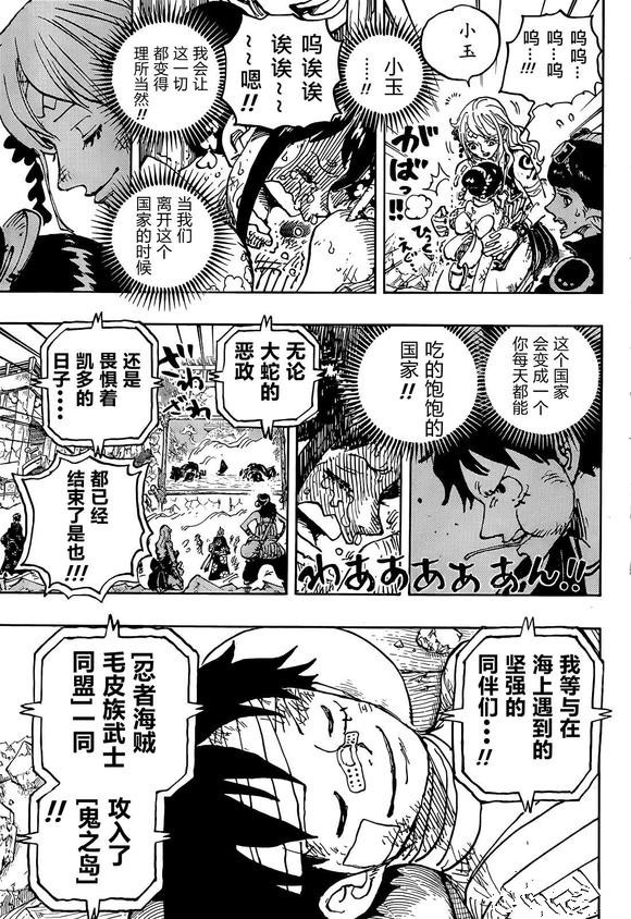 这个时候,小玉也想到了之前路飞的话,路飞说他离开之后,肯定让和之国变成一个所有人都能吃饱饭的国家。而桃之助那边还在说,他随海上遇到的盟友,组成“忍者海贼皮毛族武士同盟”,攻入了鬼岛。