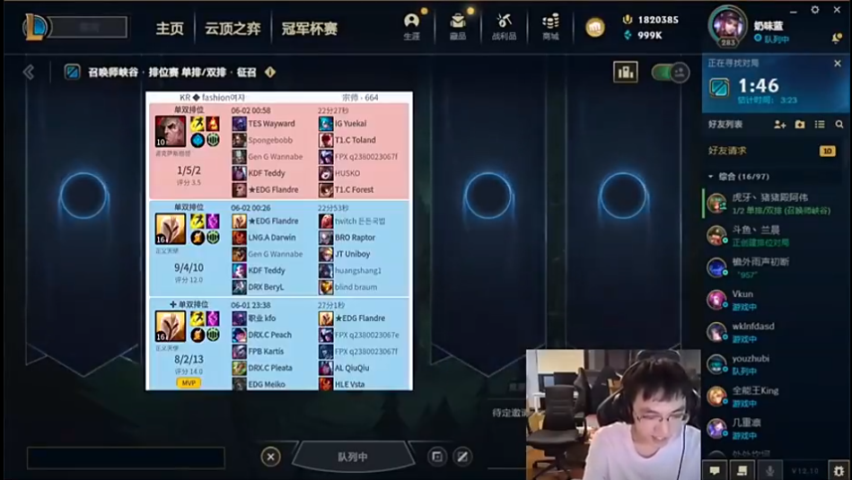 近日EDG战队上单选手圣枪哥直播打国服,有弹幕询问其为什么没打韩服。圣枪哥透露自己的韩服账号被封了,猜测可能是那盘1-5-2的乌鸦导致的,不知道得罪谁了。