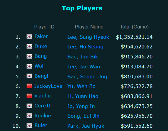LOL奖金排行:LPL赛区JackeyLove第一 Xiaohu第二