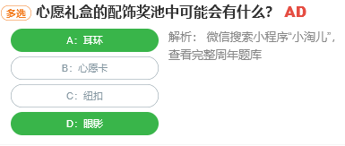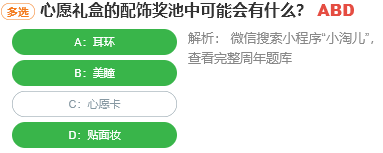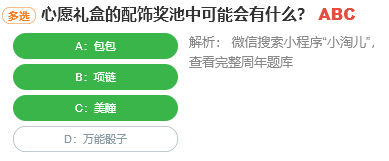 淘宝人生“桃仁300”的问答活动中每天都会有10道题目,只要答对一道题目就可以得到兑换券,“心愿礼盒的配饰奖池中可能会有什么?”,大家知道这个题目的答案是什么吗?下面就和小编一起来看看这个活动的题目答案吧。