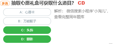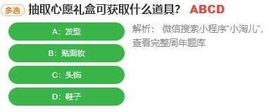 “抽取心愿礼盒可获取什么道具?”是淘宝人生3周年桃仁300中问答题目之一,只要答对了就可以兑换券,大家知道这个题目的答案是什么吗?下面就和小编一起来看看这个活动的题目答案吧。