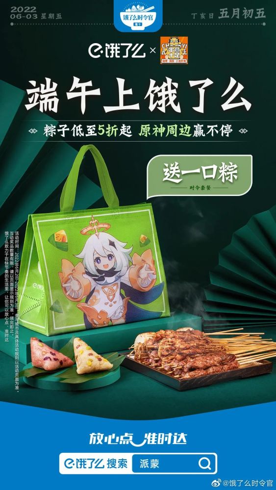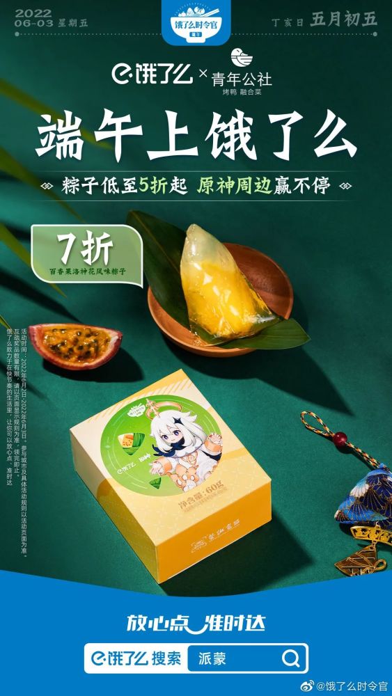 而饿了么此番的商户联合,瞄准的也不止是美食爱好者,同时也向游戏玩家和二次元圈层用户伸出了橄榄枝。推出「饿了么×原神联名包装」及端午套餐,让用户在端午期间大快朵颐的同时还能体验解锁游戏周边的快乐。