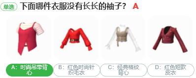 淘宝人生“桃仁300”的问答活动中每天都会有10道题目,只要答对一道题目就可以得到兑换券,“下面哪件衣服没有长长的袖子?”,大家知道这个题目的答案是什么吗?下面就和小编一起来看看这个活动的题目答案吧。