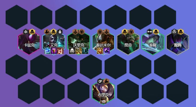 继续卡着30-50利息追三星沃里克,如果4-1沃里克来的还没超过5只建议转型其他阵容,在沃里克三星后,就可升级7人口,搜卡找到卡兹克,开出6刺客羁绊,阵容小成。