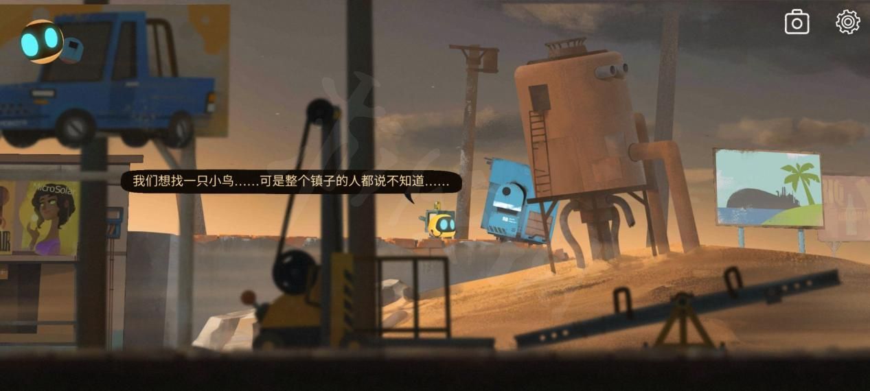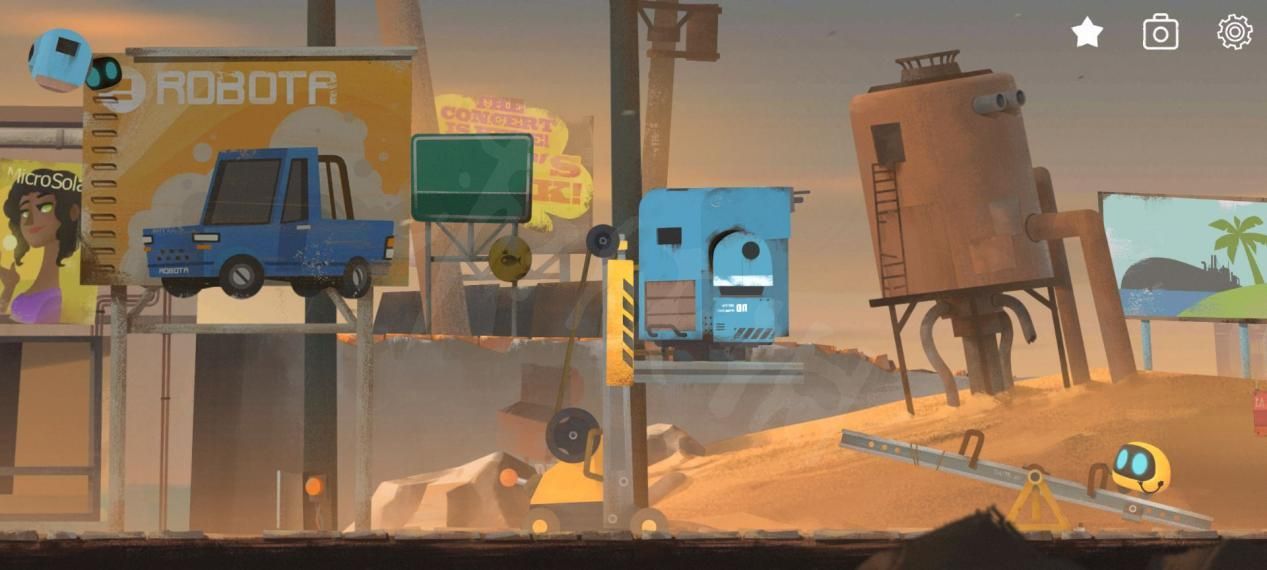 作为解谜游戏,本作的解谜并不复杂,甚至每经过一个小节点都有图纸对操作进行提示。玩家不用绞尽脑汁大开脑洞去找那些隐藏的重难点,而是很轻松地动下脑子就能解决这些谜题。不过,简单并不意味着没有趣味性,比如下图这个跷跷板——大机器人走到升降台上,小机器人过去先利用滑轮把升降台拉高,再坐到跷跷板一端;最后,大机器人跳下升降台,“砰—”地把小机器人弹到更高处的广告牌。从而顺理成章又匪夷所思地拿到解谜道具“灯泡”。