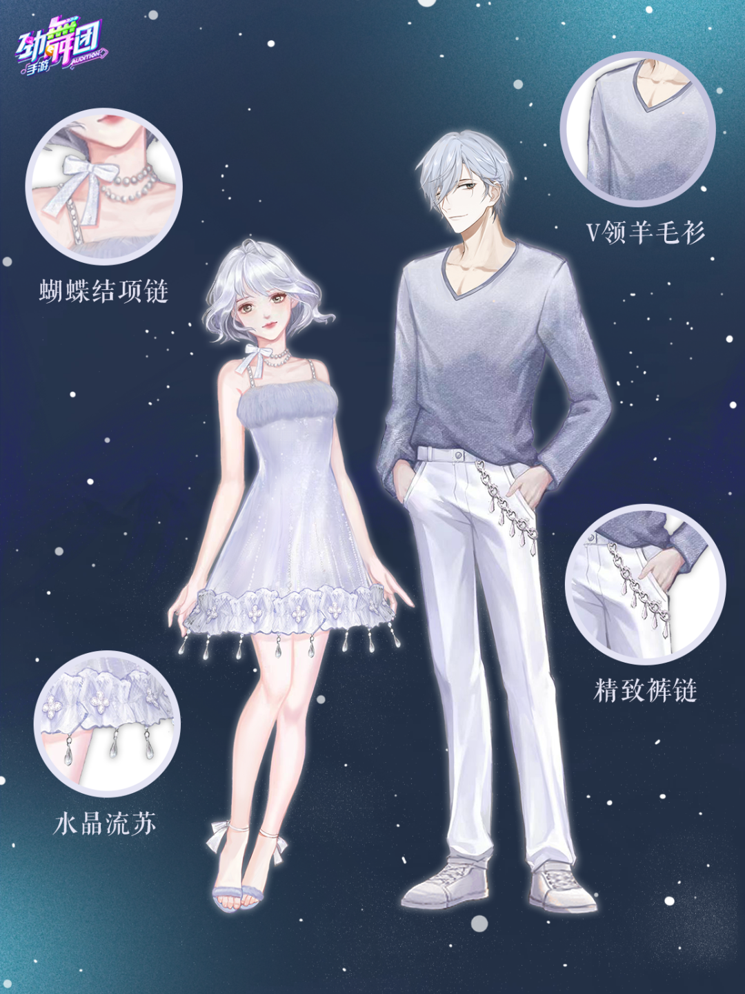 男款佳期如梦以浅紫与银白为主色调,上身为极薄的V领羊毛衫,勾勒健壮的线条,性感十足;再配上一条银白色西装长裤,腰间缀有精美银链,简约又不失精致,帅气有型。清爽夏日,微风吹拂,穿戴这样一身性感又不失温柔的服饰,约上心爱的TA,来AU世界散步,共赏美好夜景吧!