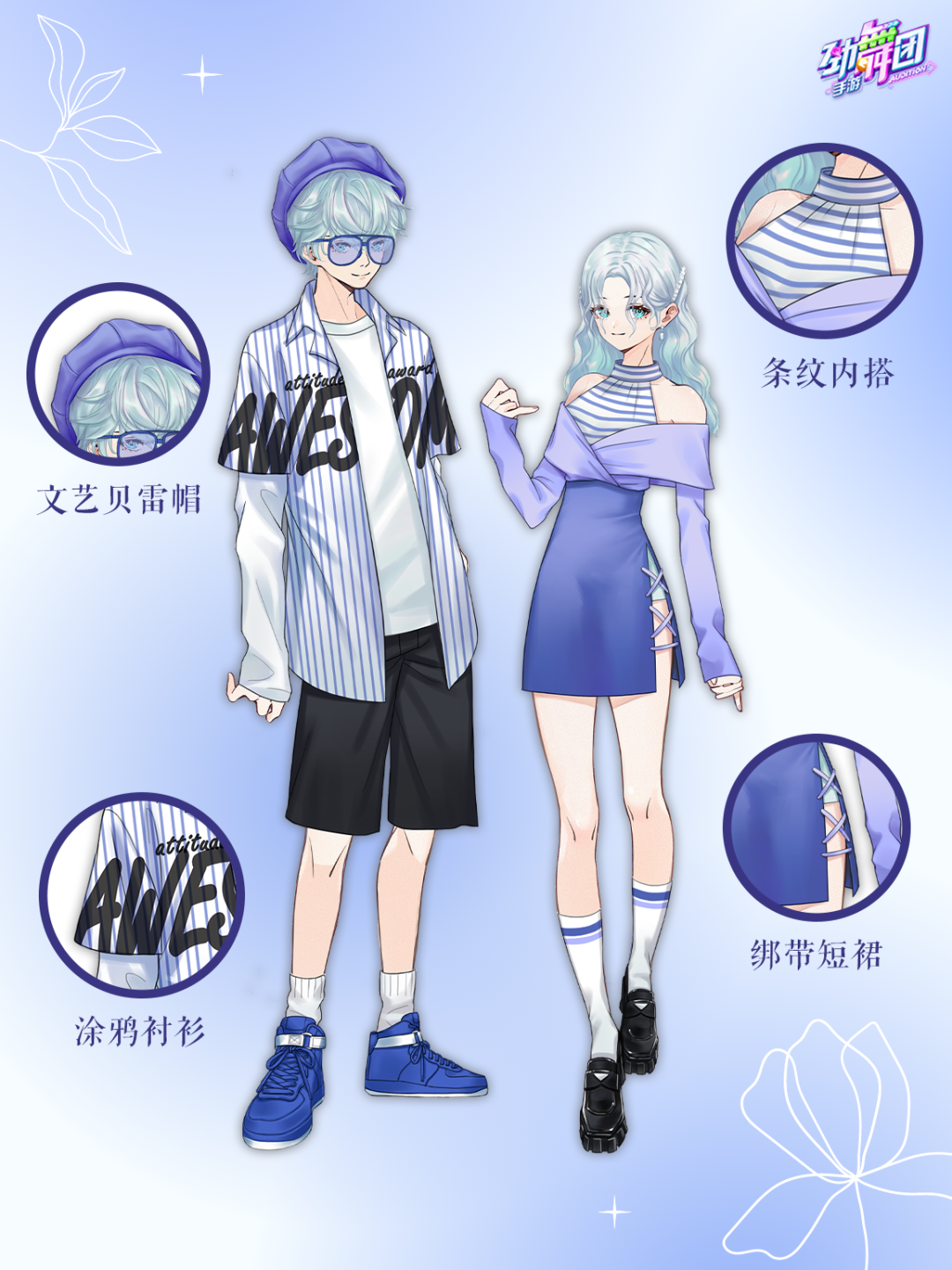 男款沁蓝恋人以黑蓝为主色系,采用淡蓝色渐变上衣搭配条纹衬衫,衬衫上的涂鸦潮酷时尚、活力又气质,叠穿的风格凸显青春与活泼,搭配简约的黑色短裤,再配上亮色贝雷帽与蓝色透明眼镜,妥妥的活力cool boy!穿戴这样一身潮酷前卫的沁蓝恋人,来AU世界与TA一同热舞狂欢,共享活力四射的美好夏日吧!