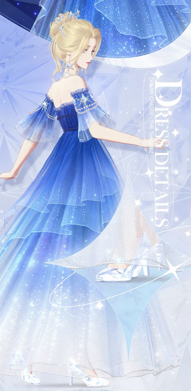 首先是【星空轨迹】,蓝色渐变裙摆搭配亮片勾勒出梦幻天际,搭配银白色水晶鞋散发熠熠光芒,如同浩瀚夜空中的群星般闪耀。