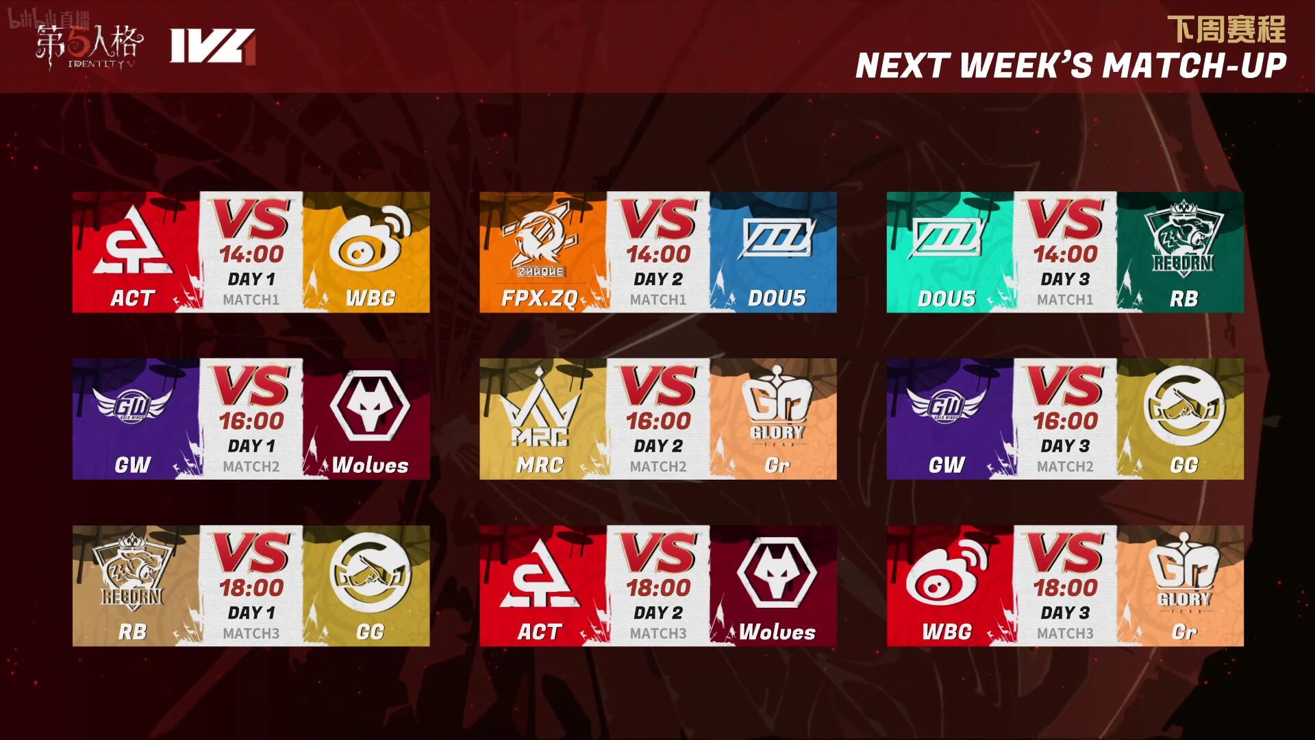 下周的首场比赛由ACT对阵Weibo,他们的发挥都十分稳定,经过了一周的沉淀,他们的碰撞又将擦出怎样的火花呢?FPX.ZQ战队在下周的比赛中将面对DOU5战队,他们能否突破DOU5_DX魔爪继续连胜?位于积分榜最末的成都GG战队和GW战队谁又将取得自己队伍本赛季的首胜?让我们将目光锁定IVL第二个比赛周,期待他们的发挥!