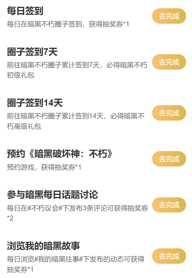 即日起至6月21日,登录大神APP即可参与探索暗黑不朽圈子,预约《暗黑破坏神:不朽》、完成“参与游戏话题讨论以及浏览游戏动态”等每日任务,即可获得抽奖券,参与抽奖,解锁游戏好礼。