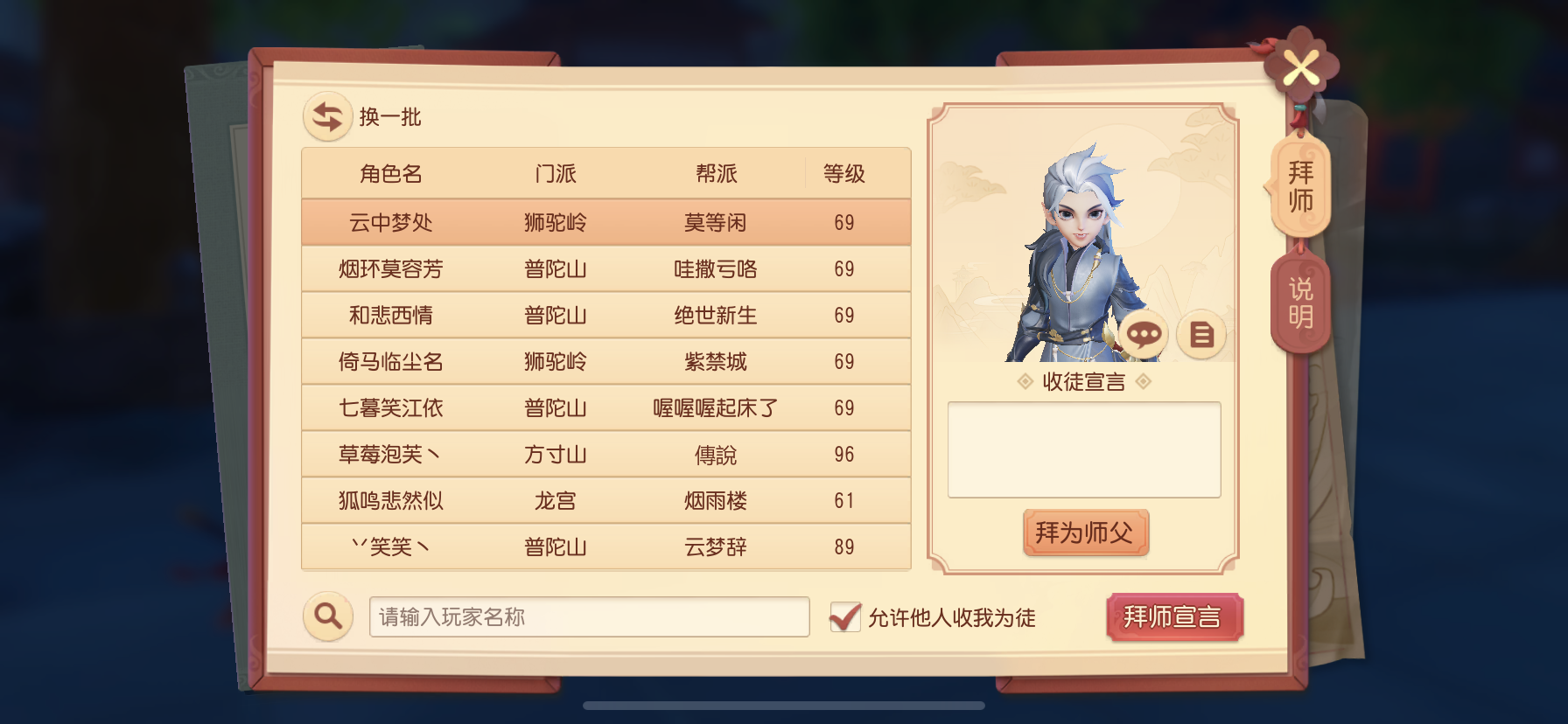 初入游戏的萌新想要快速上手游戏,向投缘的师傅拜师是最佳选择。为了方便师徒、同门之间更方便地通过师徒主界面了解彼此的情况并进行互动,师徒系统主界面迎来焕新迭代。此外,拜师、收徒【宣言】增加了个性化定制标签,对应的收徒、拜师列表内容也将更加细致全面,能更快的拉进各位少侠之间的社交距离。