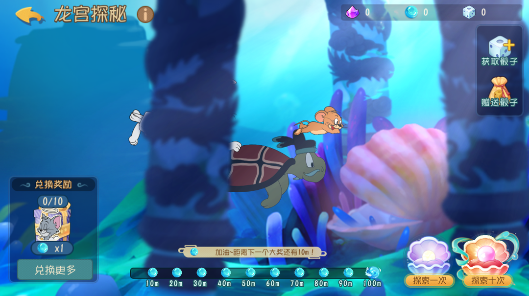 6月9日至7月10日,小伙伴们完成相关任务,即可获得投骰子次数,对龙宫进行正式探秘。每探索一次需要消耗一枚骰子,并随机前进1-6米的探索进程。探索中小伙伴们会获得紫水玉奖励,并根据前进的距离,每10米获得1个碧蓝宝珠,到达100米终点时更能直接获得1个碧蓝宝珠、250紫水玉和1个龙宫明珠的奖励!