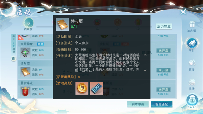 无酒不成诗,无诗不饮酒。落魄书生陆机和酿酒师清酌重回大荒,并且向少侠发出了对诗挑战!完成对诗任务可获得经验与金币奖励。清酌还会不定期赠予您苦情酒,使用后可获得酩酊大醉效果。