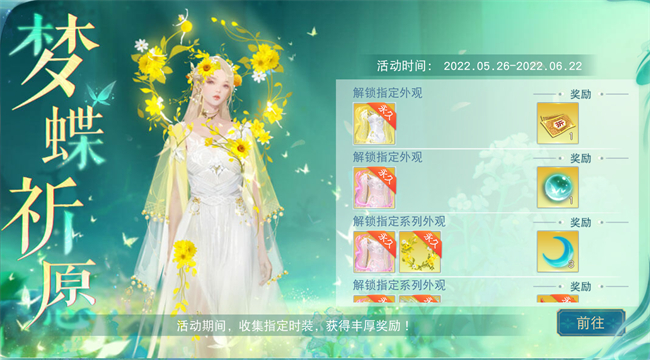 梦蝶祈福,心之所愿。5月26日至6月22日期间,全新主题外观隆重登场,碧山秋暮时装、天南星坐骑、芳菲东篱光环等精美全新外观正式上架,陪伴少侠们欢度佳节。少侠们可前往商城中购买晓梦蝶,参与梦蝶祈愿活动抽取。快快换上温柔缱绻、风度翩翩的绝美新装,一起体验福利满满的【悬壶济苍生】版本吧!