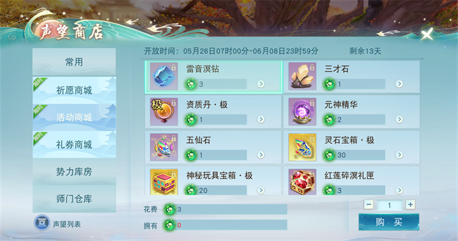 集齐三种材料提交给婉灵可获得清心散,前往声望商城可兑换雷音溟钻、三才石、资质丹·极、元神精华、五仙石等珍贵好礼,少侠们千万不要错过哦!