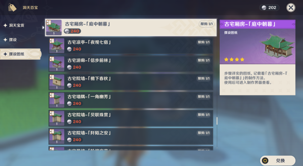 由于购买园林图纸需消耗大量的【洞天钱币】,而钱币的来源则与【洞天仙力】相挂钩。提升仙力最好的方式就是在洞天内外放置大量紫色品级的家具,【雕花庭院围墙】就是个不错的选择——单个围墙可提供90仙力,且负荷值仅占35点。在室内我们大可放些紫色折屏——单个折屏可提供90仙力,且占地面积小,为提升仙力值的绝妙之物。