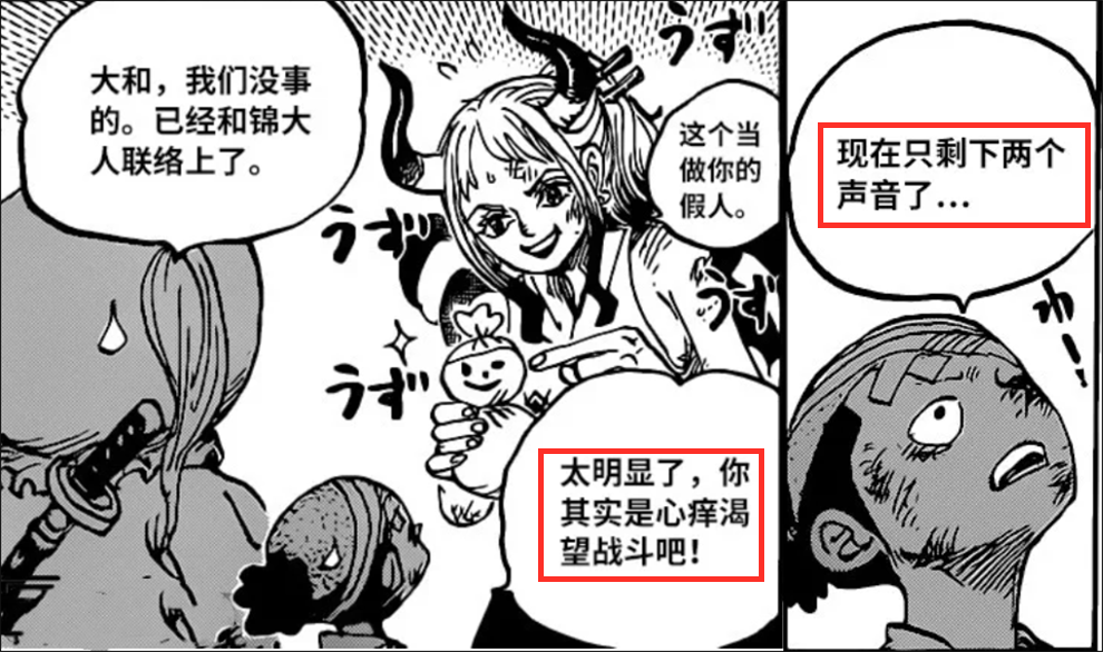 这个细节很重要,它说明桃之助绝对不简单。随后大和也知晓了上面的情况,她说“一对一”,自己必须要赶快了。大和知道路飞和凯多处于一对一的情况,为何她要赶快呢?这里可能有两个原因,其一就是上面说的“好战”,大和想去帮助路飞;其二就是大和知道凯多的软肋,她深知凯多的实力,如果去晚了,可能路飞就不行了。