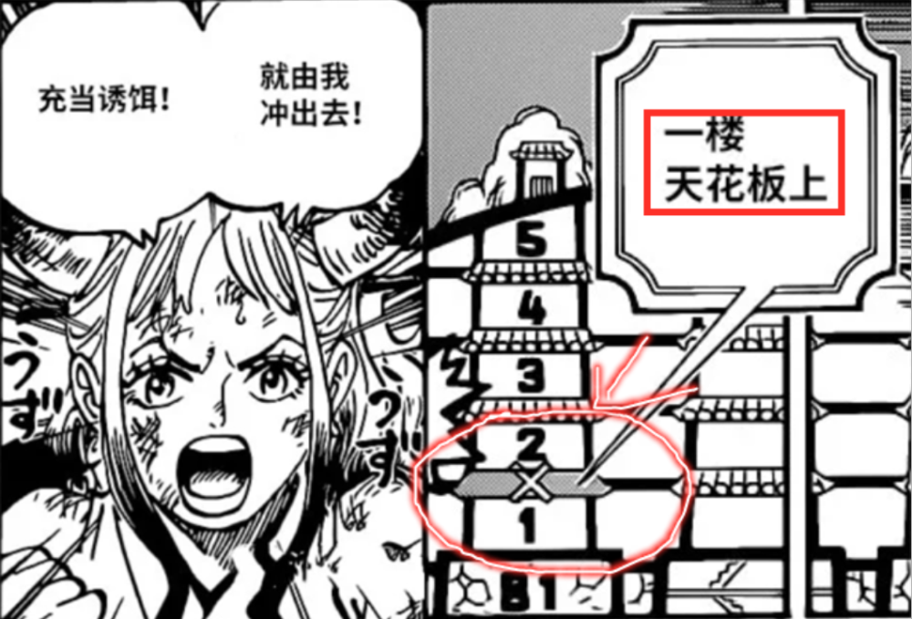 我们来简单看一下当时的情况,大和决定自己来充当诱饵,所以她让小忍把桃之助带走。这本身没什么问题,注意这里有一个细节刻画,当时,大和、桃之助以及小忍三人身处一楼天花板上面。这里一共有五层楼,最顶端就是鬼岛骷髅头顶部。也就是凯多和路飞大战的地方。