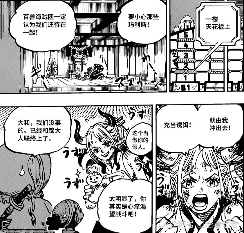 大和为了保护桃之助,不惜把桃之助藏在她的衣服里,海米都愤怒了,认为尾田在恶搞,他自己就是桃之助。桃之助一直躲在大和的衣服里,并不是办法,而且他们躲藏的地方是安全的。百兽海贼团的情报搜索迟早会发现这里,因此大和想出了一个好办法,制造出一个玩偶,让敌人误以为这就是桃之助。大和亲自充当诱饵,引诱敌人来追击大和,这个想法确实不错。
