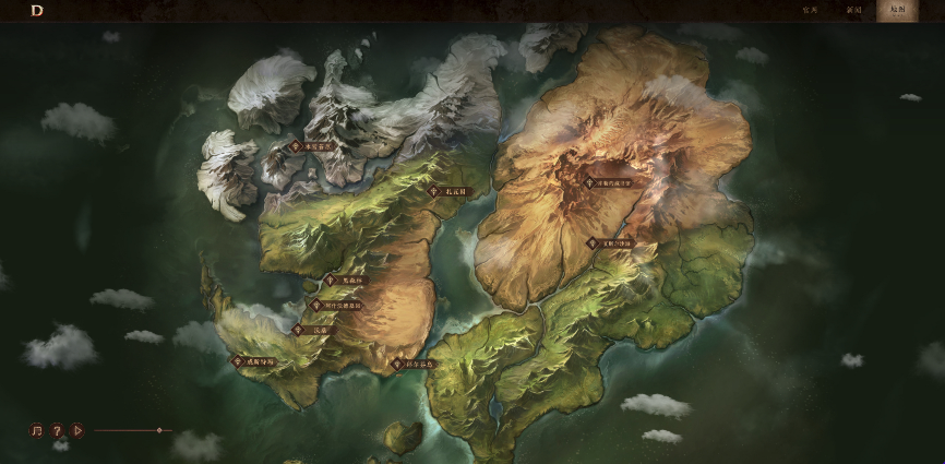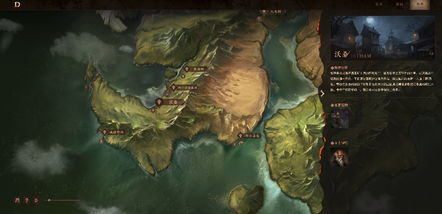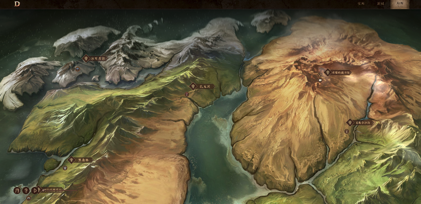 沃桑、扎瓦因、拜尔芬岛等一个个熟悉的名字映入眼帘,玩家点开地标文字就能了解到该地的故事背景以及主要NPC。而最让玩家有临场感的是当玩家滚动鼠标滚轮时,地图随之放大的同时会从一个相对平面的2D特效,转变为3D特效,真实还原暗黑与众不同的地貌风情。