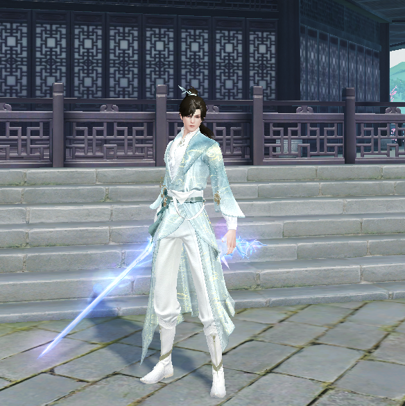 男版【碧玉芙蓉】内着衣袍如冰雪洁白,并绣以银色祥云图纹,外裳则由冰蓝色的上好丝绸织就而成,肩部暗金闪烁犹如星河璀璨,配上雅致莲花纹式的雪白滚边,浑身透露出如荷花一般出淤泥而不染、高洁清雅的气质。腰间由一条湖蓝荷叶状飘带束起,与领口间的银饰相映成趣。足上长靴如履一片深雪之上,并配以铂金色镶边,低调之间又凸显出别样奢华。
