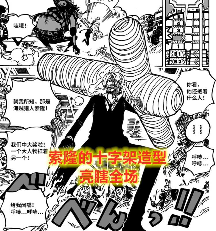 在结束两年的修行后,草帽海贼团再次重聚,他们一起进入了新世界。相比于屡战屡败的老冤家山治,索隆的战绩是相当了得,他一路过关砍将,不费吹灰之力就打败了自己的对手。在和之国篇中,索隆还迎来了最高光时刻,他以一己之力挡住了大妈和凯多两大四皇的合击技。虽然,索隆的出色表现让自己的粉丝们集体高潮了,不过他却身受重伤,奄奄一息。最后在山治别有用心的帮助下,索隆被包扎成十字架形状,他也因为这个别致的造型,给大家留下了一个名场面。