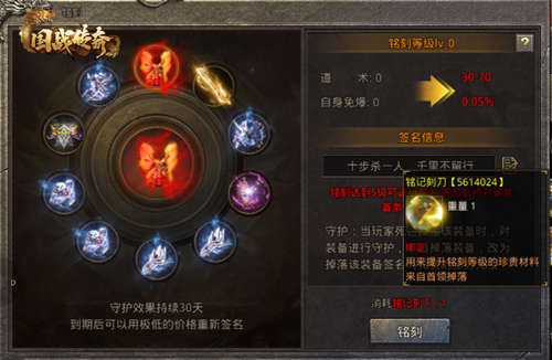 通过击杀首领已经活动可以获得铭记刻刀,可以通过消耗刻刀升级部位装备,没级提升可以增加攻击以及免爆概率,提升到5级可以对刚装备使用钻石进行签名,签名过后的装备将会被保护,掉落得时候改为掉落钻石,从而保护装备。