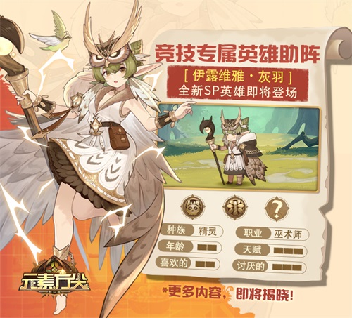 此次热血竞技版本推出的专属SP英雄【伊露维雅·灰羽】,是专为竞技而生的存在!身披羽毛编制成的法袍、头顶猫头鹰面具的形象,是她标志性的造型;而生来便受到万物生灵的亲近的她,更拥有着自然的神圣之力!当她啼哭时,神树会为她展开枝叶,林鹿和鸟儿会守候在她身边。善良、单纯的伊露维雅就像一把“钥匙”,把森林中的万物汇集到一起。主播“团子”亦是如此,她将所有喜欢竞技玩法的玩家们汇聚在《元素方尖》之中,带领大家开启通往“热血竞技”的大门!这种微妙的契合度,将团子和伊露维雅的关系紧紧联系在了一起!