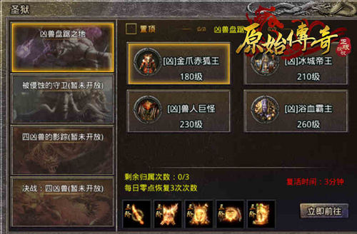 玩法介绍:Boss挑战玩法,具有多个流程,目前开放的是流程1 - 凶兽盘踞之地。玩家可进入四种地图,挑战对应首领Boss获得奖励。