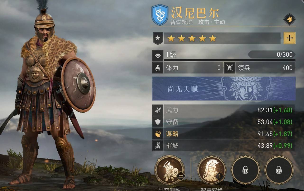 2、根据其效果可以给汉尼巴尔用,他的主将技出奇制胜能造成武力和谋略双输出,固有追击技能智勇无双在造成高额武力/谋略伤害的同时,还能降低目标主将属性,搭配战术冲锋能够与主将技产生联协效果提升自身属性。