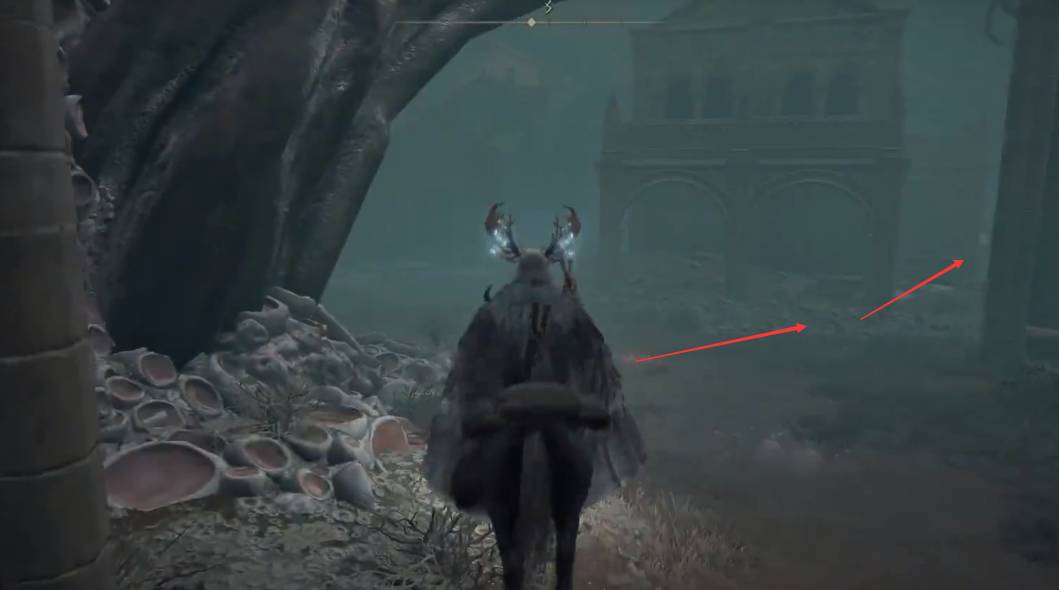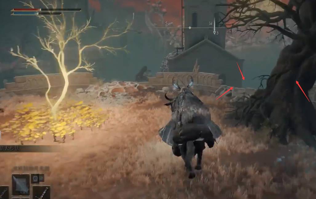 2、然后,跳下去在左边会有一根巨大树枝,我们从右边两栋房子中间的路直走,如下图,