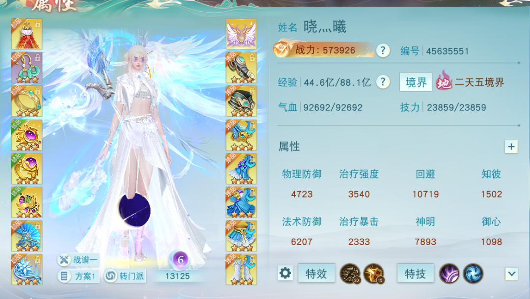 这位是我们势力超级奶妈:晓灬曦的属性,10719点的回避加上7893点的神明,辅以20回气,又能扛又能打,同时带有3540点治疗强度和2333点治疗暴击,在战斗时可以源源不断的提供治愈之力,把队友的安全感直接拉满。