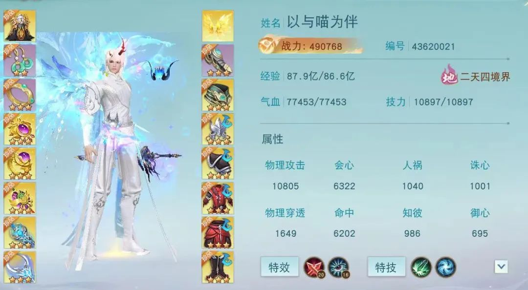 这是风起天阑势力的弈剑扛把子:以与喵为伴,10805点物攻和6322点会心,让他拔剑的时候能打出超高伤害!再配合6202点命中,无论是在战场还是副本,都是最顶级的战力!