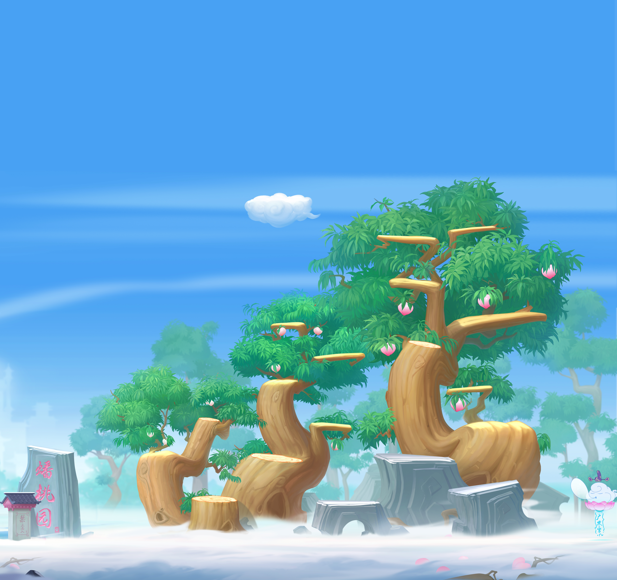 蟠桃园中种植着许多桃树,三千年一熟的能得道成仙,六千年一熟的可长生不老,九千年一熟的更能天地齐寿、日月同庚。