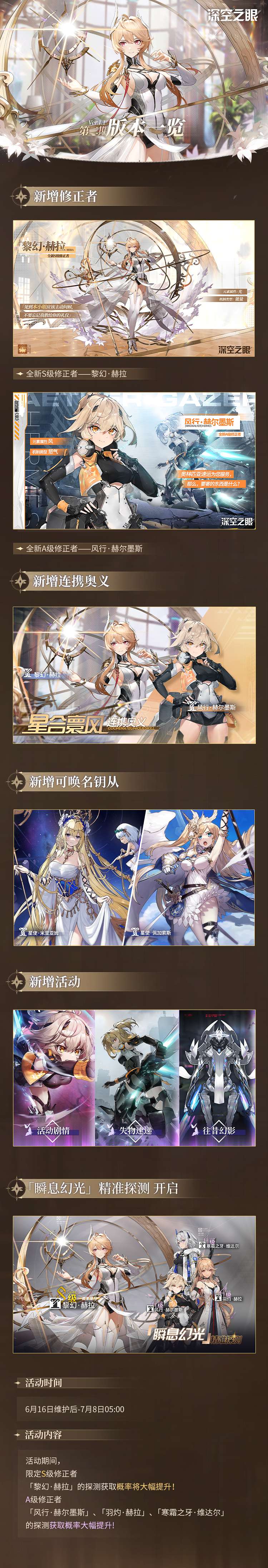 「瞬息幻光」活动探测同步开启,活动期间,「黎幻·赫拉」概率提升!A级修正者「风行·赫尔墨斯」、「羽灼·赫拉」、「寒霜之牙·维达尔」的探测获取概率大幅提升!