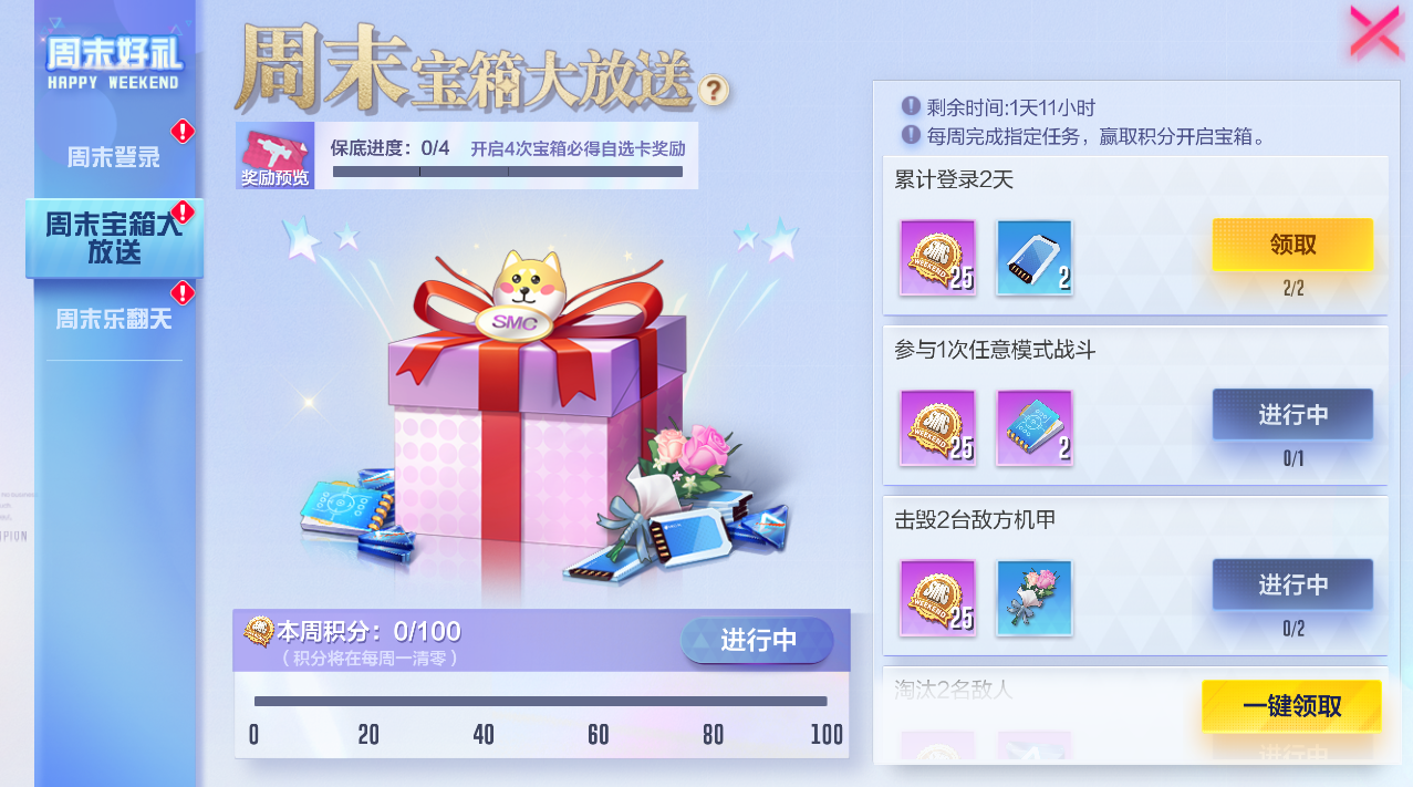 周末期间完成指定任务,即可获得周末训练积分,收集积分开启宝箱,即得A级武器自选卡等好礼。