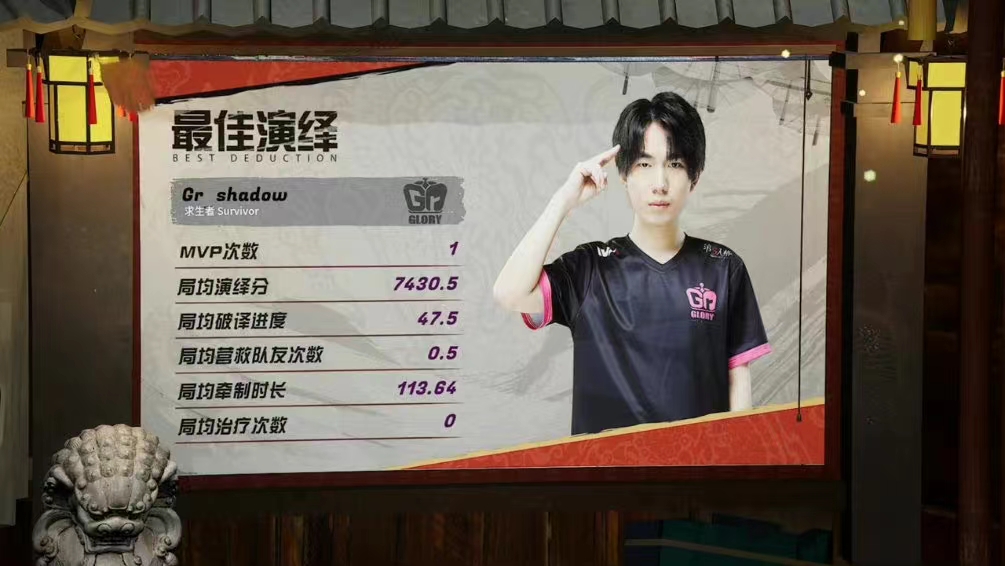 随后进行的第二局比赛中,Gr战队选出地图永眠镇,再次由监管选手ppx先行上场,以角色女巫面对对方的强ob及牵制阵容,在前期形势极端不利的情况下,最终保平;下半场比赛中,Gr的求生者们面对对方监管熟练度并不高的新角色柯根,佣兵在开门战时成功救人,一个完美四出直接锁定当日胜局。