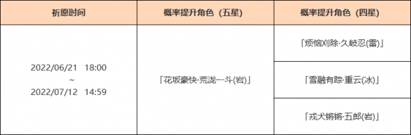 活动期间,限定五星角色「花坂豪快·荒泷一斗(岩)」的祈愿获取概率将大幅提升!