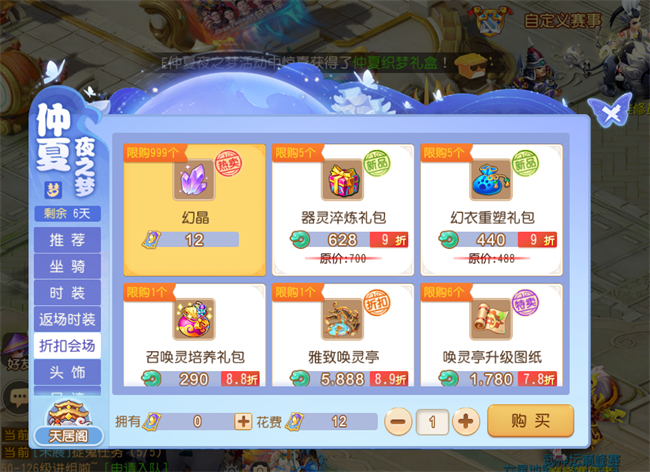 玩家在仲夏夜之梦抽奖中所获取的特卖礼券,可以用于在仲夏特卖商店中,兑换全新惊鸿羽坐骑、夜宴回响/圆舞奏鸣时装以及诸多特惠道具!在此次仲夏特卖商店中,《梦幻西游》手游准备了多款返场时装、诸多折扣道具、还有全新头饰/足迹/队标等商品供大家选购。所以,各位玩家不妨利用此次机会,以最优惠的价格购入各种好物,让自己在各大社交场合更显风采吧!