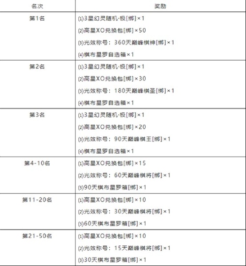 活动结束后,根据弈棋积分将设立对应榜单,届时,位列全区全服前50名者,可获得如下奖励: