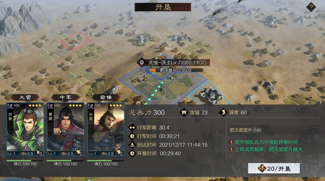 在全新的沃土玩法当中,玩家在攻占沃土之后,可以通过开垦土地来提升土地肥沃度,肥沃度达到上限时土地便会立即变为丰收状态,对资源获取、税收、屯田收益皆有大幅加成。
